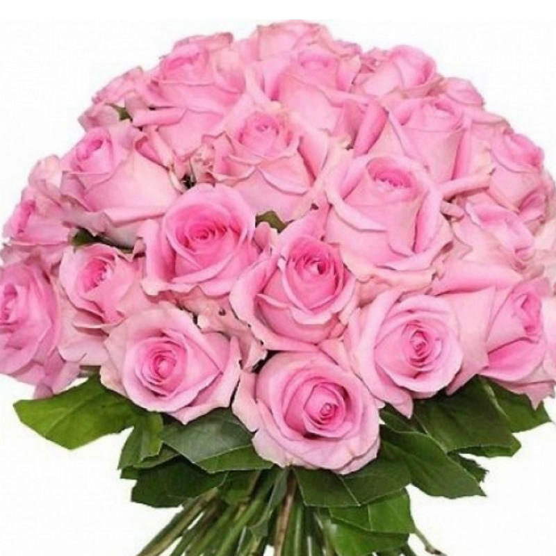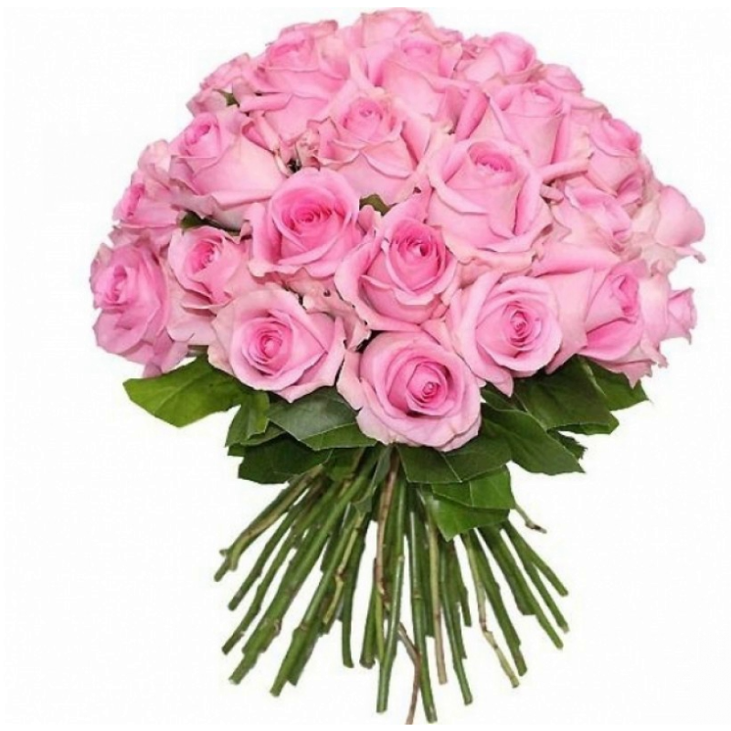 Букет состоит из 45 розовых роз, прозрачная упаковка, атласная лента.