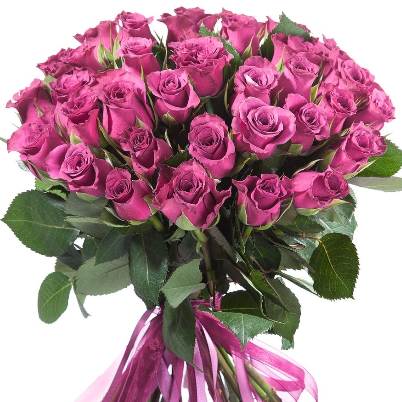 Букет состоит из 35 розовых роз, прозрачная упаковка, атласная лента.