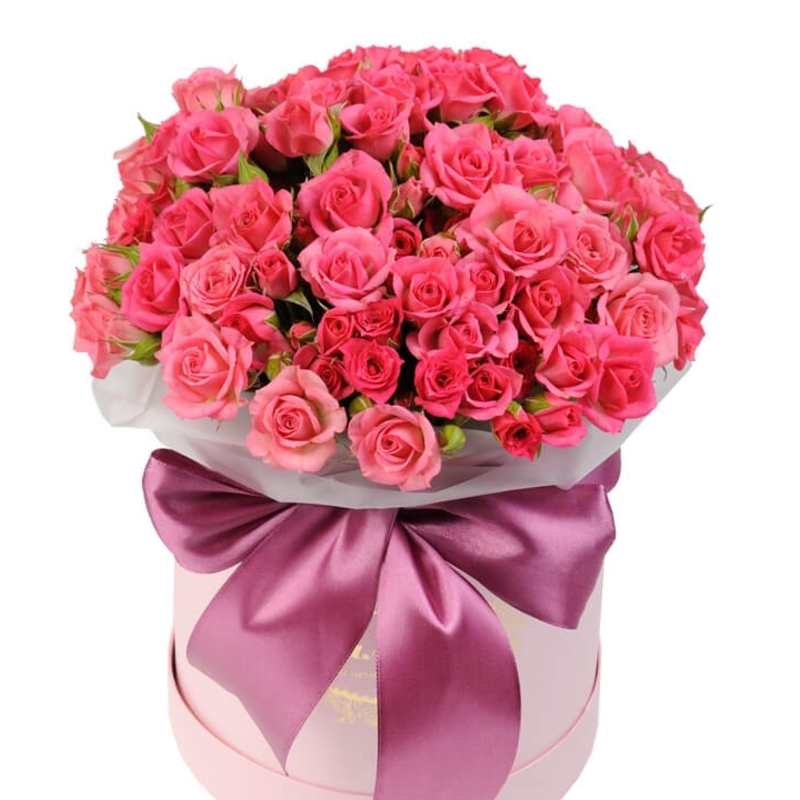 Букет состоит из 19 розовых кустовых роз, коробка, оазис, атласная лента.