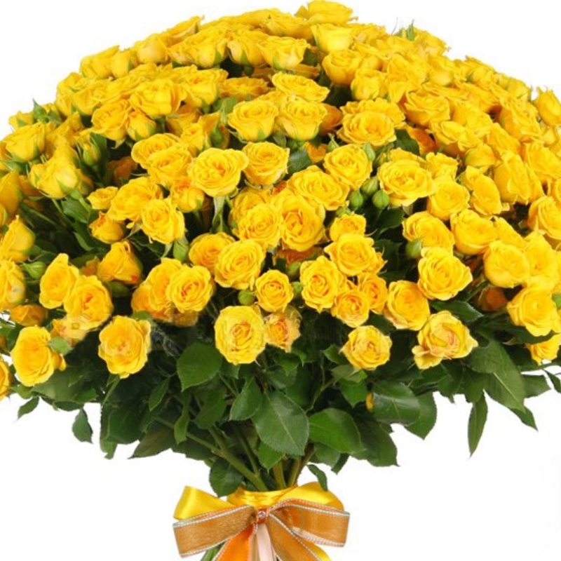 Букет состоит из 51 желтая кустовая роза, прозрачная упаковка, атласная лента.