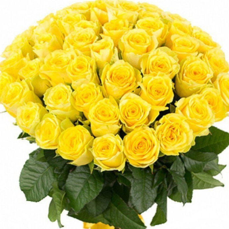 Букет состоит из 45 желтых роз, прозрачная упаковка, атласная лента.