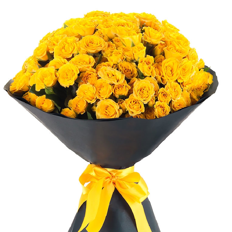 Букет состоит из 25 желтых кустовых роз, крафт, атласная лента.